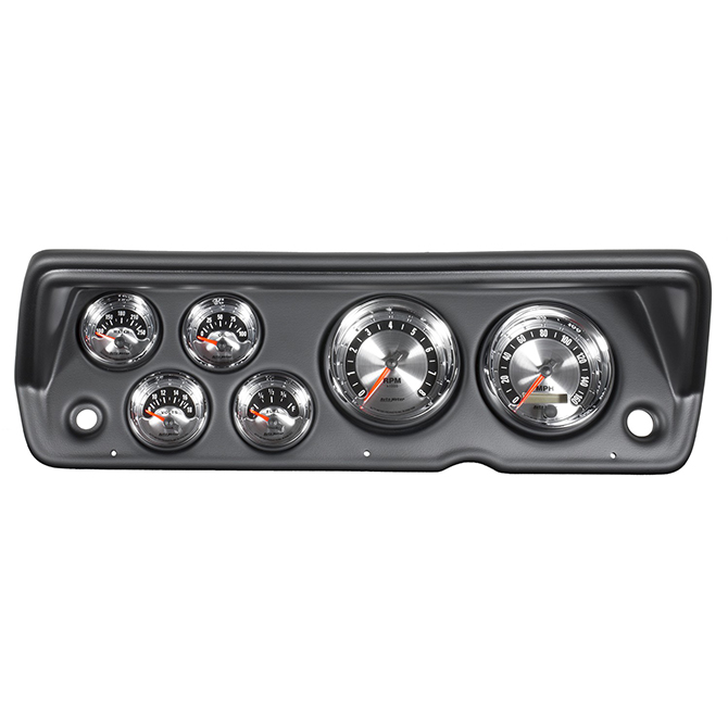 Upgrade your muscle car or classic truck with an Auto Meter direct-fit American Muscle dash kit. Each easy-to-install package includes a durable replacement dash panel and six iconic American Muscle series gauges featuring spun metal dials and bright chrome bezels. White LED through dial lighting ensures optimal visibility during low-light conditions while Auto Meter's easy, no fab installation allows you to preserve the original interior of your classic ride.
