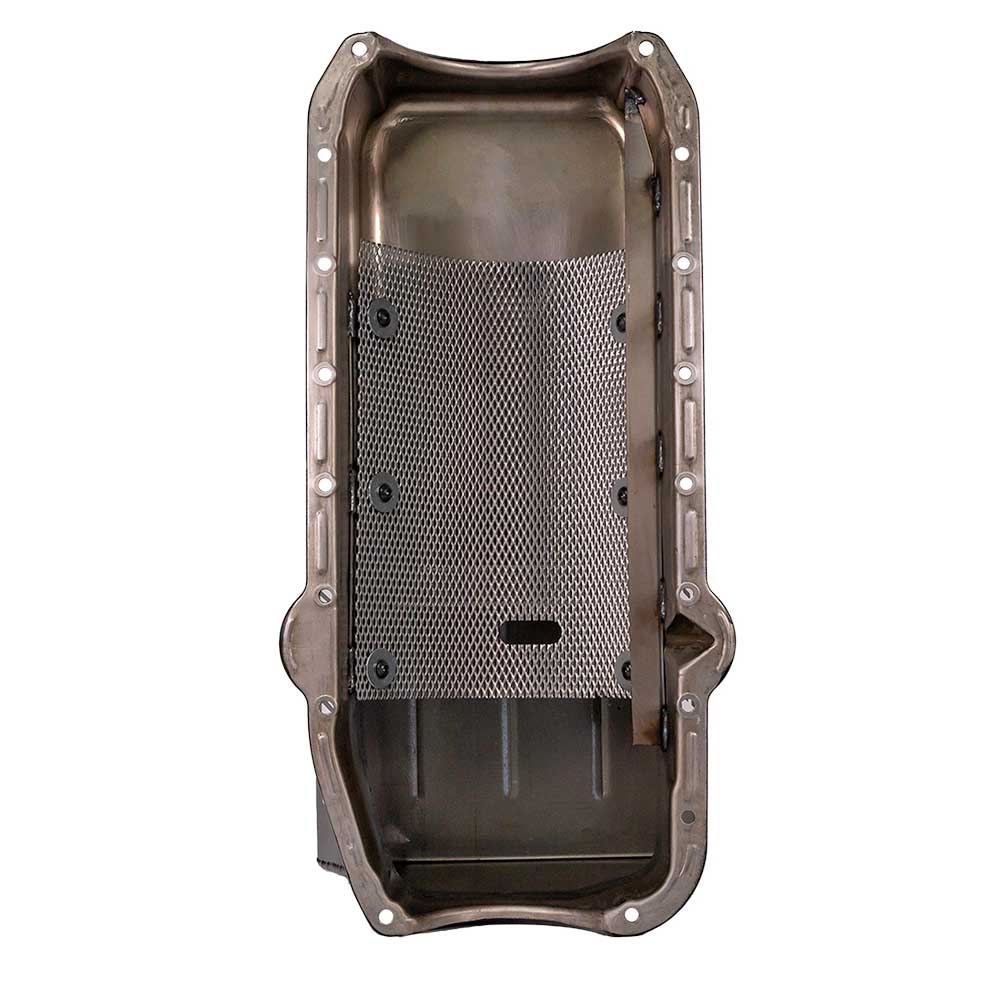 Kicked Out Sump Oil Pan; 7 Qt.; Wet Sump; Trapdoor Baffling; Integral Crank Scraper; Uni-Directional Windage Tray Screen; Chevy Small Block; Clear Zinc Steel;