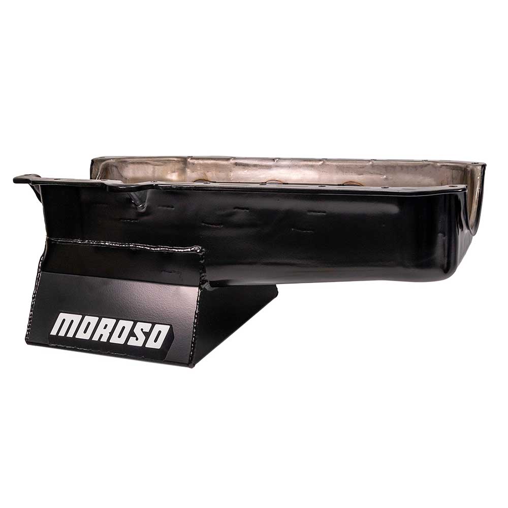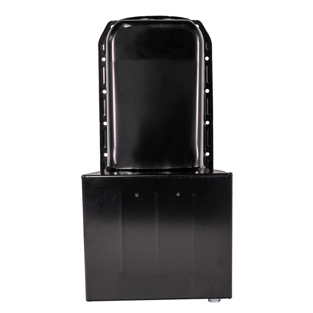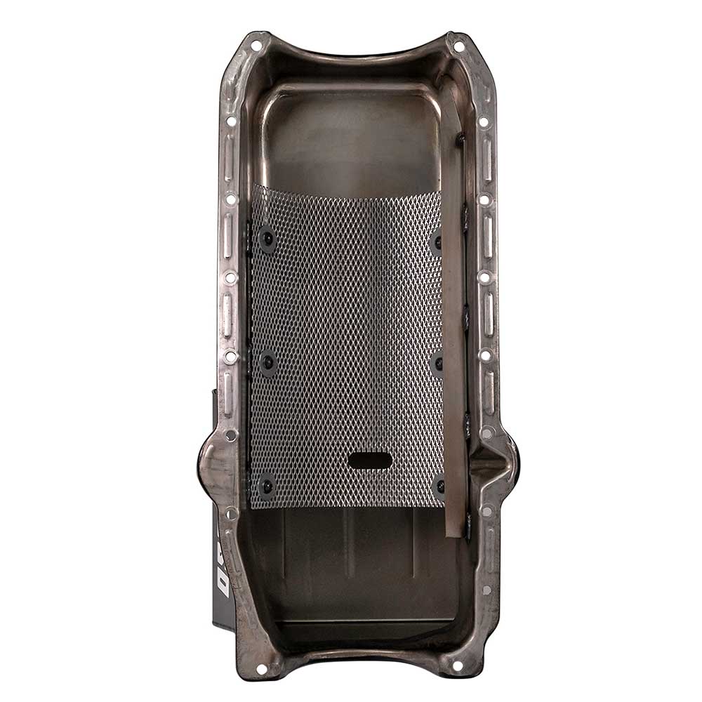 Kicked Out Sump Oil Pan; Blocks w/1 pc. Rear Main Seal and Passenger side Dipstick, 7 Qt.; Wet Sump; Trapdoor Baffling; Integral Crank Scraper; Uni-Directional Windage Tray Screen; Chevy Small Block; Clear Zinc Steel