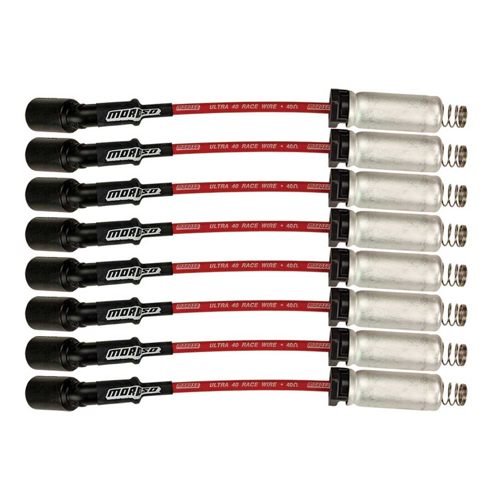 GM LS Series Ultra 40 9 3/4" Long Unsleeved Race Ignition Wire Set, Fits stock or tall Moroso valve covers, Fold over crimping won't vibrate loose like other brands, Nylon pull tape under silicone jacket provides unbeatable pull strength and terminal retention. Red wire