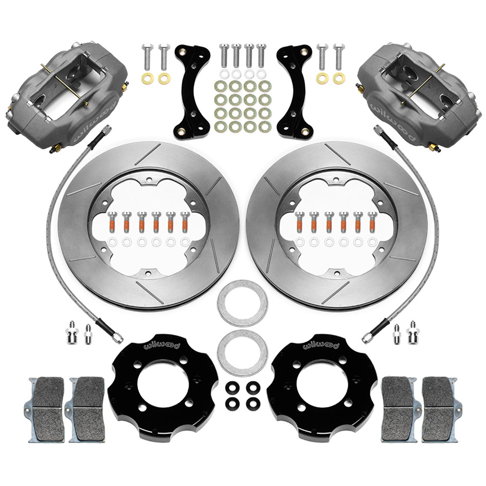This kit is configured for dedicated road racing on the 1990-2005 model year Mazda MX-5 Miatas. It requires 15” wheels designed with additional inside clearance to accommodate the larger than stock brake package. The four piston DP/ST calipers used in this kit feature a forged aluminum body with a Type III Mil-Spec hard anodized, medium gray color finish. Hard anodizing provides superior wear resistance in the piston bores, and high resistance to abrasion and corrosion throughout. Thermlock® pistons are used to reduce heat transfer from the pads to increase fade resistance, and to extend service life by decreasing temperatures in the caliper body, fluid, and seals. Internal damper springs and controlled retraction, high-temperature piston seals assure consistent pedal height from start to finish. Caliper piston volumes are sized for compatibility with OE power brake boosters and master cylinders, and are easily configured with manual brake conversions and balance bar pedals using appropriately sized master cylinders. Spec37 alloy, GT competition series 11.00” diameter 72 vane rotors are mounted to either the OE hubs, or Wilwood racing ProHubs, with weight saving forged aluminum hats. Unsprung and rotating weight are minimized while providing high cooling efficiency and rugged durability with thermal stability in sustained high heat competition. Mounting brackets, including all premium grade fasteners, secure the calipers in the stock location, without modifications. This race winning system is completed with high temperature, high friction, endurance compound race pads selected specifically by application. Stainless steel braided flexlines are included in each kit to complete the installation.