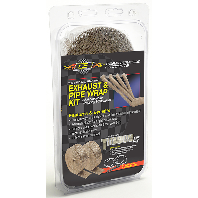 Exhaust Wrap Kits solve the problem of knowing exactly what you need to wrap exhaust pipes and manifolds and dose it in an all-in-one kit.An all-in-one kit for wrapping a set of headers or motorcycle pipes. Kit includes two 2in” x 50ft rolls of exhaust wrap, Locking Ties and Free Locking Tie Tool. Comes in Retail Clamshell Packaging The header wrap kit is enough for any set of V8 headers. The Header Wrap Kit will wrap from the top of the header where it bolts to the heads all the way down to the collector. Exhaust Wrap Kits save you time and money.