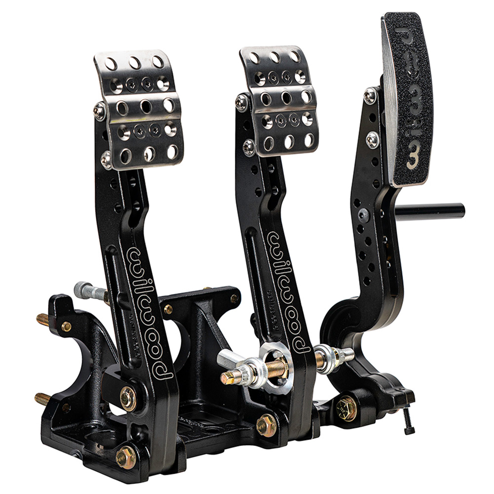 Adjustable ratio Tru-Bar brake pedal, in a floor mount throttle, brake and clutch pedal assembly for rear engine cars. Pedal head adjusts vertically to provide a 4.75, 5.25, or 5.75:1 ratio for more feel or less pedal effort. A clutch and two brake master cylinders mount to the assembly, with a friction-free, trunnion based adjustable Tru-Bar balance bar providing front to rear brake bias fine tuning. The throttle pedal includes a pull rod for rear engine applications. The non-skid waffled pedal pads can be laterally adjusted to place the clutch and brake from 3.75 to 5.75 inches on center for driver preference. The pedals feature a lightweight aluminum frame, with high strength reinforced I-beam style forged pedal arms.The Tru-Bar incorporates a positive detent stop every full turn to maintain adjustment position and can be locked in place with the included jam nut, or used with an optional remote knob for quick on-track adjustments. Tru-Bar pedals utilize a fixed trunnion bearing in the pedal arm, with spherical rod-end bearing pushrod attachments reducing compliance and friction for more accurate brake feel. Tru-Bar pedals utilize the same chassis and master cylinder mounting as Wilwood balance bar style pedals. This pedal accepts three Wilwood 2.25 inch vertical mount flange single outlet master cylinders, available separately in a variety of styles and bore sizes.