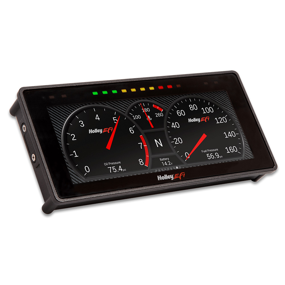 The Holley EFI 6.86" Pro Dash is customizable with a variety of gauge and indicator screens that can be programmed to display any parameter you need from a Holley EFI system. It also includes an integrated ten LED shift light as well as two LED's on the top left and two on the top right that can be programmed as desired.