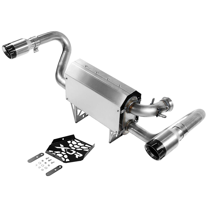 This new bolt-on performance exhaust system is for the 2017-2018 Can-Am Maverick X3 with the turbocharged engine. Features include 409S stainless steel construction with a 2.50" mandrel bent inlet tube flowing into a "straight-through" cross-flow performance muffler with dual 2.25" mandrel bent tailpipes tucked up high within the rear fenders providing a moderate to aggressive deep sound level. The tailpipes contain USFS qualified spark arrestors and are finished off with a pair of 3.50" dual wall brushed 304s stainless steel tips with black anodized aluminum ends. The factory exhaust cut-out is replaced with a stainless heat shield with the Flowmaster logo laser cut into the shield showing everyone behind you why your X3 sounds so good. Includes all hardware and installation instructions necessary for a simple at home installation. Made in the USA.