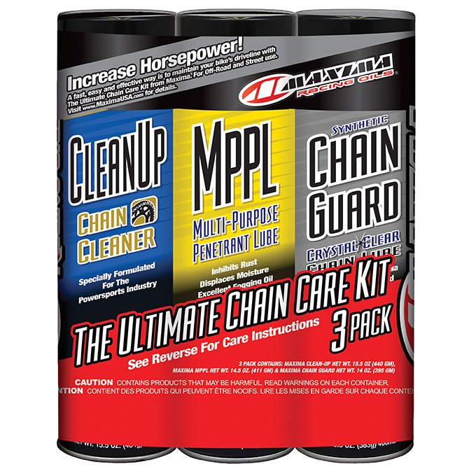 CleanUp, MPPL and Chain Wax or Syn Chain Guard are a winning combination proven to increase horsepower and extend chain and sprocket life. Maxima CleanUp is an emulsion-type cleaner excellent for chains, sprockets that easily washes out with water. Maxima MPPL (Multi-Purpose Penetrant Lube) is a superior, all-purpose spray-on penetrating lubricant that provides an excellent barrier against rust and corrosion. Great for displacing moisture. Maxima Chain Wax & Syn Chain Guard are America’s #1 chain lubricants. Exclusive formulas penetrate and protect your chain from the elements while extending your chain’s life. For street & off-road use.