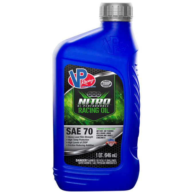VP Nitro Hi Performance Racing Oil SAE 70 is designed for use in high-performance competition engines under extreme load, torque and high-temperature conditions including racing, drag racing and tractor pulling fueled by gasoline, diesel, alcohol or nitromethane where an SAE 70 non-synthetic oil is recommended. The high viscosity, with an aggressive base oil film and enhanced levels of ZDDP, allows for excessive blow-by into the oil while maintaining critical film protection to engine parts.
