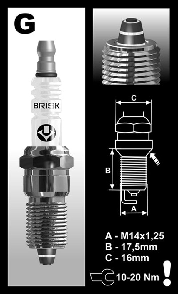 Brisk premium racing spark plugs are a multi spark exposed center core and 360 degree earth electrode design. Made out of silver the center core is isolated by a laser deposited ceramic insulator. This manufacturing system gives far superior utilization of fuel energy and reduction in fuel consumption of new and older engines.