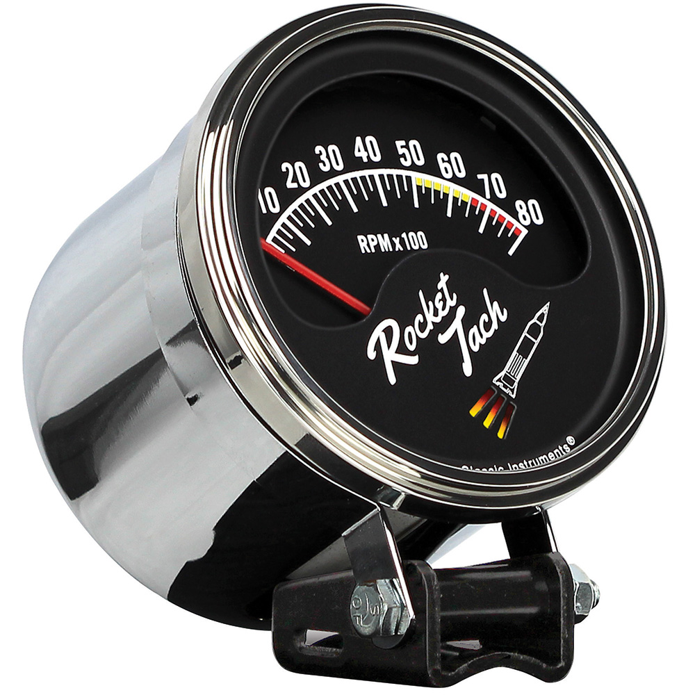 This half-sweep 3 3/8", 8,000 RPM;tachometer features a dual layer design, color changing rocket booster, a red pointer, a rich black face with bright white numerals and indices, and LED lighting. Finished with a stainless low step bezel and flat glass the Rocket Tach comes installed in a chrome cup that allows for a variety of mounting positions. It is easily calibrated with pushbutton control for four, six, or eight cylinder engines and includes a single snap-in wiring harness for ease of installation. Great for completing that retro look with the latest electronic technology, the Classic Instruments Rocket Tach is truly a blast from the past. Vintage styled tube packaging included!