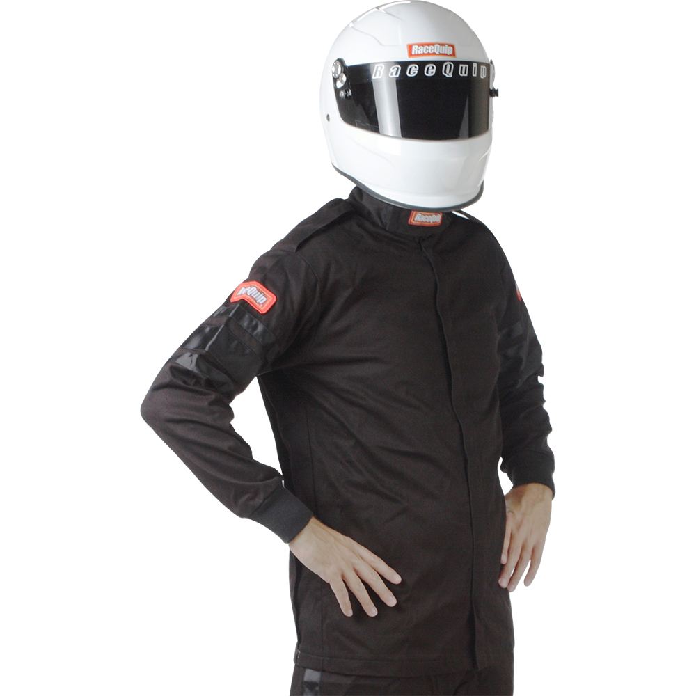 The RaceQuip 110 series single-layer SFI-1 racecar drivers fire suit is made from Pyrovatex FRC material. Note that sometimes this material is referred to as fireproof, but actually all auto racing safety gear is fire retardant. Pyrovatex offers the maximum combination of overall flame and heat protection, durability and comfort for the price. This fire retardant cotton based (FRC) material is used because it retains the softness and breathability of cotton and will wick away moisture from the skin. Pyrovatex fabric is gentle and non-irritating to even the most sensitive skin. The treatment process leaves the exterior surface shiny and supple. Since the Pyrovatex process combines a chemical agent with the raw cotton fibers to create a bond at the molecular level, with proper care, the suit will retain its flame retardant properties beyond the useful life of the garment. All racing suits are assembled with heavy-duty, multi-needle, over-lock safety stitch machines to provide exceptional seam strength. All RaceQuip suits feature a high quality heavy duty Nomex backed brass zipper installed with a double overlap for a more secure front opening. Stylish contrasting armband stripes match the full-length leg stripes. The black accents: high-back collar, leg and arm cuffs, epaulets and beltline give the RaceQuip driving suit a unique look and style. Add to this the pleated back panel for freedom of movement, deep bag pockets and the adjustable euro-style belt, and you have a single layer drivers suit that provides an outstanding value. Exceeds SFI 3.2A/1 specs with a TPP rating of 11. Available in Black, Red and Blue with Black arm and leg stripes and manufactured in sizes from Small – XXX-Large (refer to sizing chart).