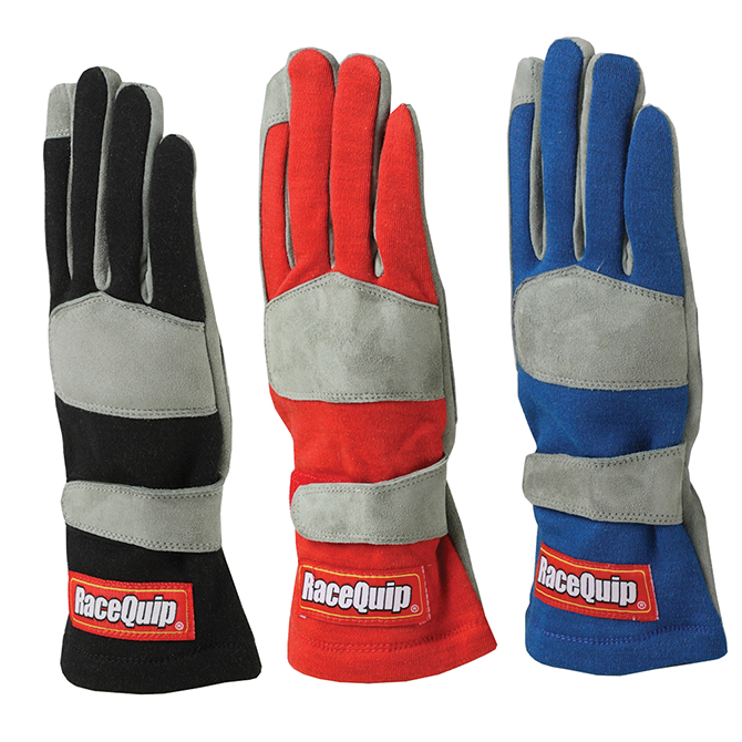 RaceQuip 351 Series auto racing gloves are a one layer Nomex and suede leather glove built to SFI-1 specifications that provides a soft and supple feel. The grey suede leather palm adds a premium look and extra grip to this affordable SFI 3.3/1 rated driving glove. The knuckle pad and palm reinforcements attach to the Nomex knit back in a way that promotes flexibility. Extra leather has been added between the index finger to the end of the thumb in the high-wear area. The 351 Series single layer Nomex(R) motorsports gloves feature a standard length gauntlet with an adjustable velcro(R) closure on the back to ensure a proper fit. These affordable Nomex(R) racing gloves are SFI 3.3/1 certified with SFI tags affixed to the wrist. Available in Black, Red, or Blue in sizes Small - X-Large.