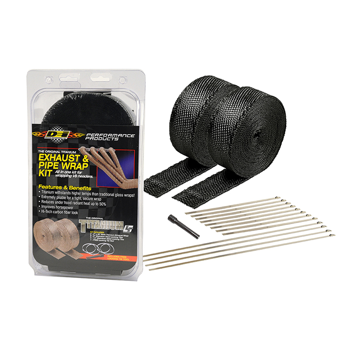 Exhaust Wrap Kits solve the problem of knowing exactly what you need to wrap exhaust pipes and manifolds and dose it in an all-in-one kit.An all-in-one kit for wrapping a set of headers or motorcycle pipes. Kit includes two 2” x 50ft rolls of Black Titanium exhaust wrap, Locking Ties and Free Locking Tie Tool. Comes in Retail Clamshell Packaging. The header wrap kit is enough for any set of V8 headers. The Header Wrap Kit will wrap from the top of the header where it bolts to the heads all the way down to the collector. Exhaust Wrap Kits save you time and money.