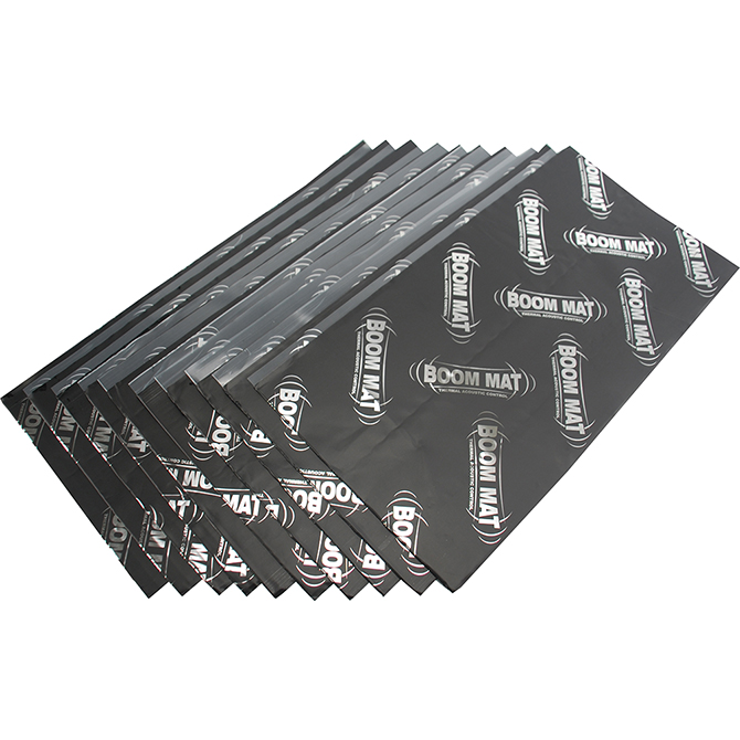Boom Mat is a high quality simple and effective solution in eliminating the low frequency noise problems found in structure-borne vibrations caused by typical automotive noise sources. Simply trim to desired size, peel backing and apply to a clean surface.Boom Mat is constructed of a viscoelastic polymer layer protected by a durable aluminum wear surface and it’s strong adhesive backing is unaffected by extreme hot and cold temperatures and can be applied to horizontal, vertical and inverted areas on metal, plastic, fiberglass and most other automotive surfaces. Available in a variety of sizes for a cost effective installation.Use as a first layer for areas with contours and bends for vibration damping needs