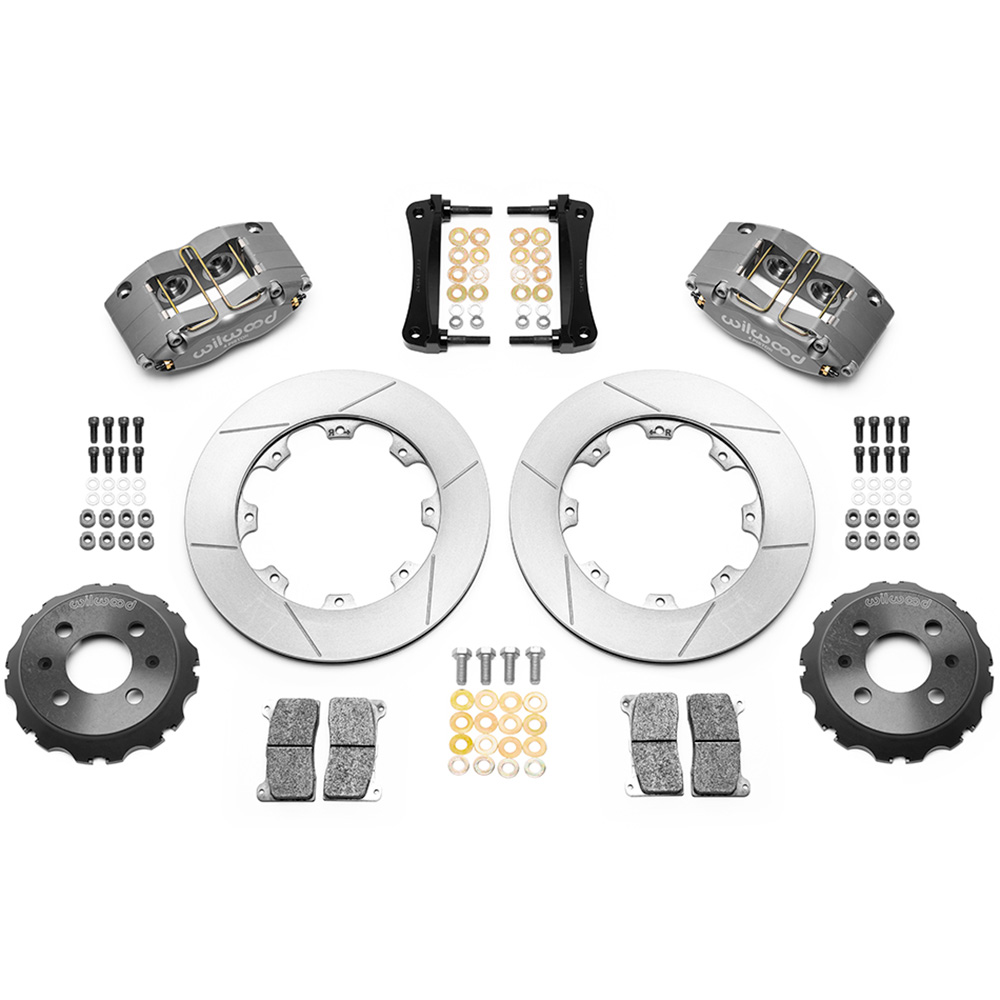 This kit is configured for dedicated road racing on all 1990-2001 Acura Integra 4 lug models, and the various model Honda Civics, CRX’s, Del Sols, and Fits, and that are equipped stock, or have been upgraded to use the large bearing hubs and OE spindles that originally used the 262mm / 10.32” diameter rotors. It requires 15” wheels designed with additional inside clearance to accommodate the larger than stock brake package. The four piston DPR/ST radial mount calipers used in this kit feature a forged aluminum body with a Type III Mil-Spec hard anodized, medium gray color finish. Hard anodizing provides superior wear resistance in the piston bores, and high resistance to abrasion and corrosion throughout. Thermlock® pistons are used to reduce heat transfer from the pads to increase fade resistance, and to extend service life by decreasing temperatures in the caliper body, fluid, and seals. Internal damper springs and controlled retraction, high-temperature piston seals assure consistent pedal height from start to finish. Caliper piston volumes are sized for compatibility with OE power brake boosters equipped with the larger 15/16” to 1.00” bore master cylinders, and are easily configured with manual brake conversions and balance bar pedals using appropriately sized master cylinders. Spec37 alloy, GT competition series 11.75” diameter directional vane rotors are dynamically mounted to the OE hubs with weight saving forged aluminum hats. Unsprung and rotating weight are minimized while providing high cooling efficiency and rugged durability with thermal stability in sustained high heat competition. Mounting brackets, including all premium grade fasteners, secure the calipers in the stock location without modifications. This race winning system is completed with high temperature, high friction, endurance compound race pads selected specifically by application. Stainless steel braided flexlines are required for installation, and must be ordered separately by the specific vehicle year, make, and model.