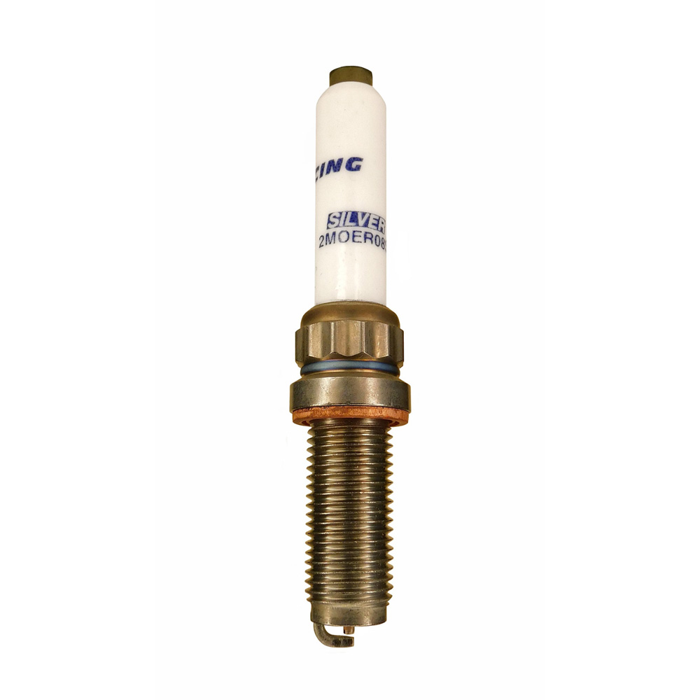BRISK SILVER RACING 2MOER10S spark plug. 12mm thread, 1.05"(26.1mm) reach, 14mm Bi-Hex, gasket seat, non-projection tip, resistor, silver center el., cut-back ground electrode, VW cup terminal nut.