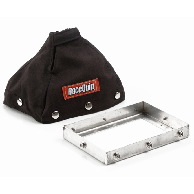 The RaceQuip Standard Fire Retardant Shifter Boot Kit includes both a mounting base and cover to provide a fire barrier between the transmission tunnel shifter opening and the driver. The boot is 6 tall and made from two layers of high quality Banox FRC material with a small velcro(R) top closure for ease of installation. The pre-drilled aluminum frame measures 7 1/2 by 5 1/2 and features snaps to secure the boot onto the base. Non SFI rated - black only - sold as one complete kit.