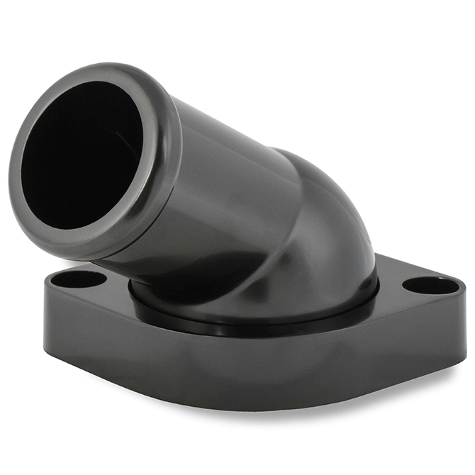 The popular Mr. Gasket GM LS water necks are now available in black or a polished aluminum finish. The mounting holes on these water necks are slotted to fit all model years of the GM LS Series engines. Choose from the 30 degree swivel style or a straight water neck. These water necks match the new black and polished accessory drive brackets and are Ideal for use in engine swap applications.