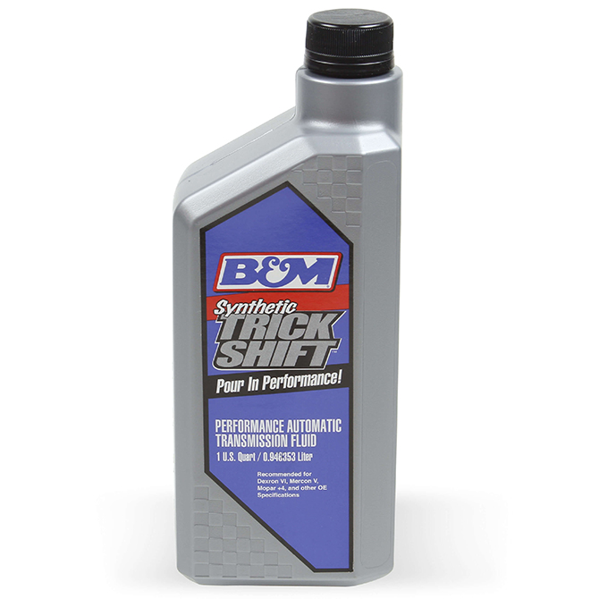 Back by popular demand and with an improved formula, B&M Synthetic Trick Shift transmission fluid is specially formulated for modern-day electronic automatic transmissions. The 100% synthetic base was chosen for its foam inhibitors, superior resistance to oxidation and its high shear stable control additives for superior resistance to viscosity loss between maintenance intervals. Synthetic Trick Shift is optimized with special friction control additives preventing slip and shudder, resulting in smooth positive shifts. Also contains special wear and seal protection chemistry commonly found in premium factory transmission fluids preferred by O.E.M. manufacturers. Compatible with other types of automatic transmission fluids but for optimum performance, it is recommended to drain and replace all transmission fluid with B&M Synthetic Trick Shift. Available separately in 1-quart bottles. Note: Not recommended for use in CVT, Type F, or dual-clutch transmissions.