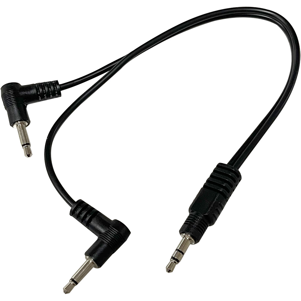 1/8" mono male to dual 1/8" mono male right angle plugs. This adapter cable is required for use with our RE4388 USLCI harness, to connect to SOLO Series or RACEiver devices.