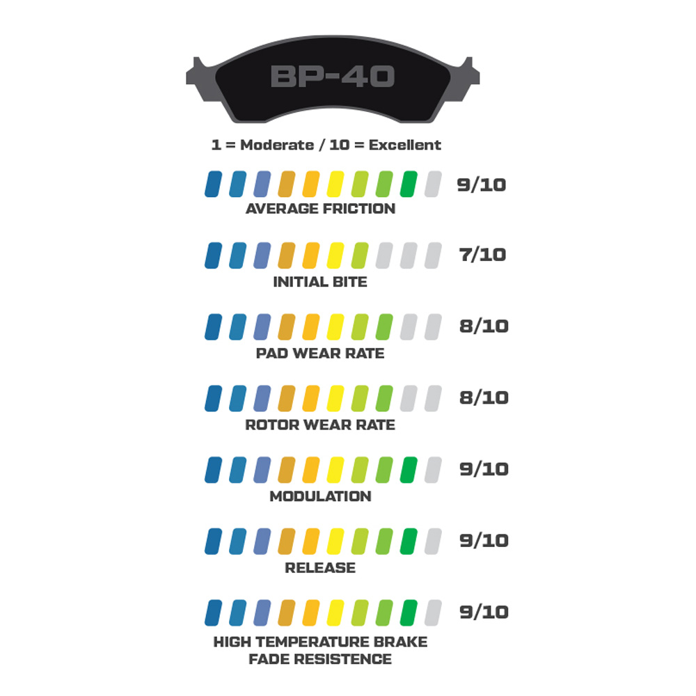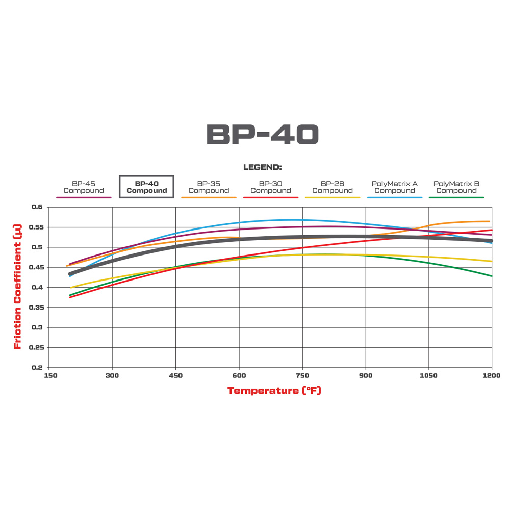 Wilwood’s BP-40 compound has been formulated to provide an immediate and aggressive low-temperature response with very high friction. The linear response throughout the temperature curve provides predictable behavior and excellent modulation. Racers enjoy the low wear rate and high heat resistance to fading. Suitable for iron, steel, stainless steel, super alloy, and titanium rotors.