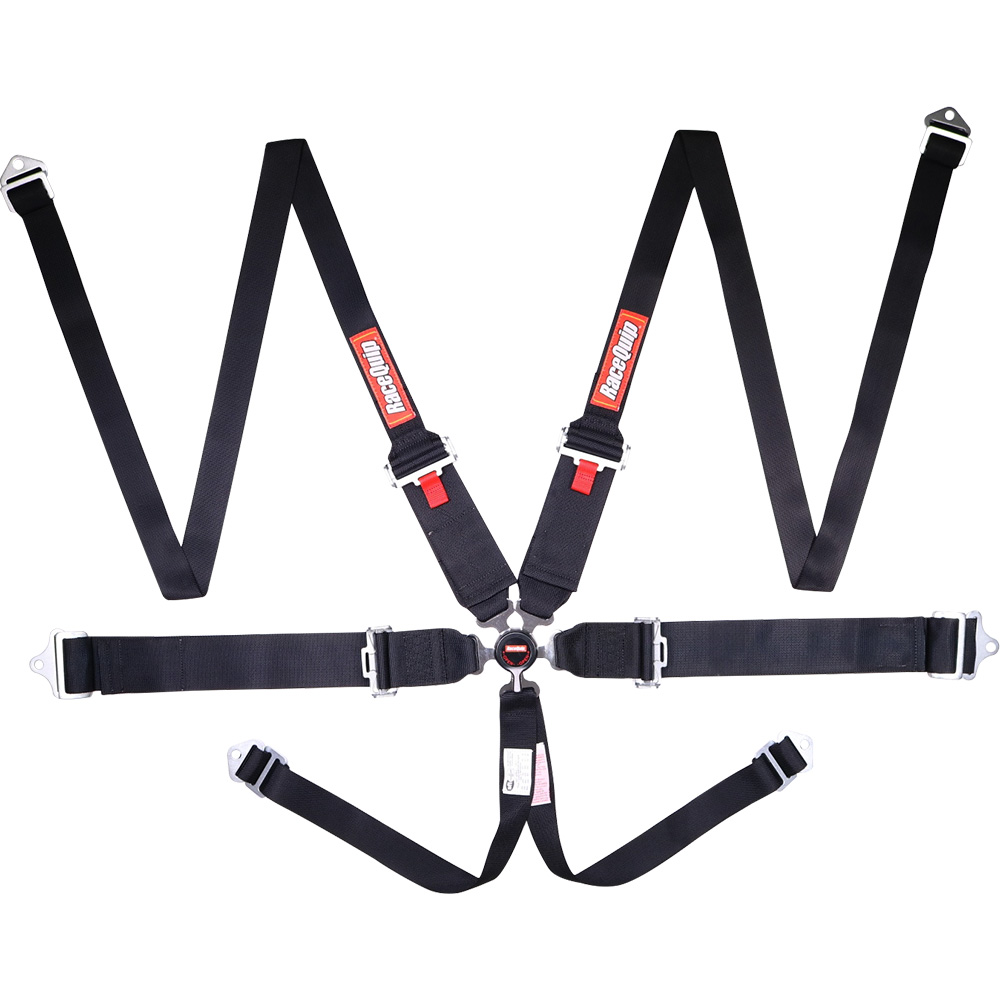 RaceQuip’s 6-Point Pull Down Camlock Harness System features twin individual HANS / HNR style shoulder belts and has an SFI 16.1 Rating. The lightweight aluminum alloy cam buckle provides precise spring pressure for a positive feel when rotating the lever to the 45 degree (right or left) unlatch movement. This 6-pt HANS / HNR seat belt system also has a pull down lap belt design which means you pull the lap belt ends away from the cam buckle to tighten the belts. The cam buckle stays attached to the right side lap belt when not in use. The dual crotch belt has two ends for mounting, but uses only one mounting tab going into the cam buckle. This auto racing harness is manufactured using premium 3 polyester webbing that reduces to 2 above the shoulder adjusters, and drop forged steel 3 bar slides and bolt on hardware ends. The double adjustable ends allow mounting as either wrap around or bolt-in. Shoulders adjust from 25 to 72 and lap belt adjusts from 30 to 70. NOTE: RaceQuip motorsports harness sets and seat belts are NOT D.O.T. / FMVSS 209/302 certified for on highway use. They are only to be used in racing vehicles off of public streets and highways. All racing harness sets are designed to be mounted in a race vehicle to a rollcage or harness bar - if you do not have either, you should not try to install any RaceQuip harness set or seat belts. All SFI 16.1 rated RaceQuip harness sets can be re-webbed and re-certified upon expiration. Available in black or red - one set of seat belts equals one seat.