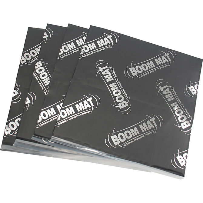 Boom Mat is a high quality simple and effective solution in eliminating the low frequency noise problems found in structure-borne vibrations caused by typical automotive noise sources. Simply trim to desired size, peel backing and apply to a clean surface.Boom Mat is constructed of a viscoelastic polymer layer protected by a durable aluminum wear surface and it’s strong adhesive backing is unaffected by extreme hot and cold temperatures and can be applied to horizontal, vertical and inverted areas on metal, plastic, fiberglass and most other automotive surfaces. Available in a variety of sizes for a cost effective installation.Use as a first layer for areas with contours and bends for vibration damping needs