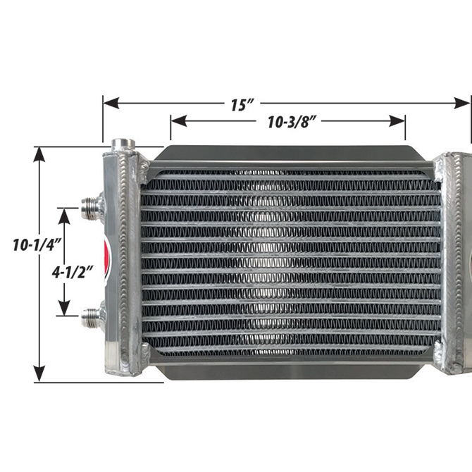 One quart capacity oil cooler is 14.75″ long x 6.25″ tall. Internal oil turbulator and louvered fins ensure maximum efficiency, AN 12 outlets and inlets, 1/2″ FTP for oiltemperature sending unit.