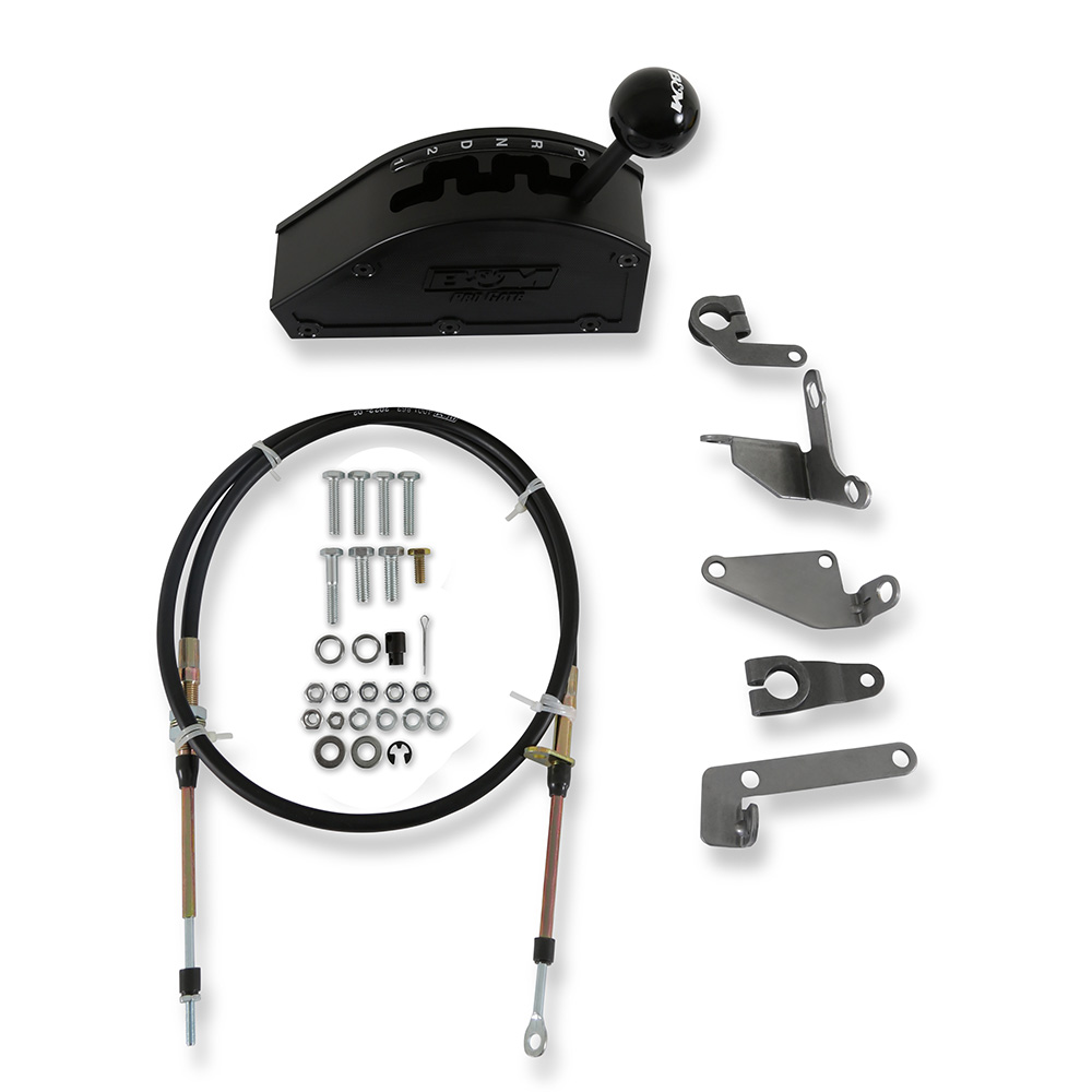 B&M Pro Gate shifters are externally gated race shifters. The compact and lightweight design features a 10-gauge black oxide-coated 304 stainless steel base with a heavy-duty 303 stainless steel shift pin for longevity and bullet-proof performance. This model is ideal for use on 1966+ Chrysler, 1972+ AMC, and Ford C4, C5, and C6 transmissions. It will also work with Ford AOD, AODE, 4R70W, E40D, and 4R100s but requires the use of selector lever kits (sold separately). The 1018 steel shift stick includes a black B&M logo shift knob for shifting duties while the external gate plate is constructed from black oxide-coated 11-gauge 304 stainless steel for durability. Other features include thick injection-molded nylon side covers featuring a knurled texture with the B&M Pro Gate logo on both sides. The covers are removable for access to the virtually maintenance-free shifter sub-assembly and will not gum up with dirt affecting shift performance, which is ideal for Off-Road racing. The rear-exit cable design includes a black 5-ft Super Duty race shifter cable along with a cable bracket, shift lever, and all necessary hardware for a straightforward installation.