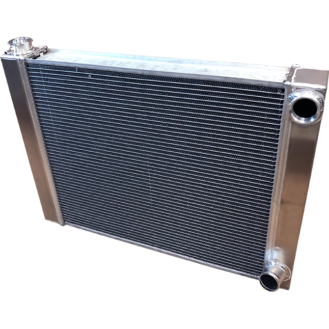 BSC 28in x 19in GM Double Pass Dimpled Aluminum Radiator - Top Right Inlet / Angled Bottom Right Outlet