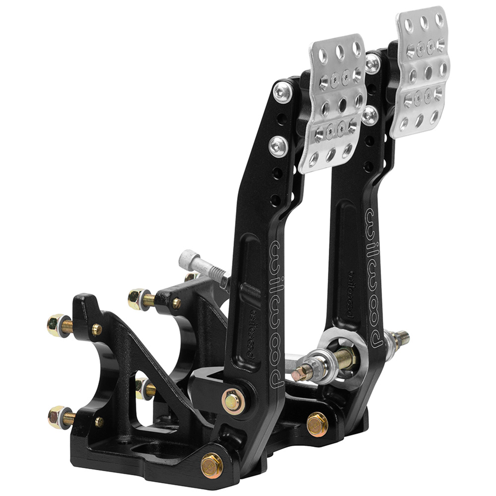 Adjustable ratio Tru-Bar brake pedal, in a floor mount brake and clutch pedal assembly. Pedal head adjusts vertically to provide a 4.75, 5.25, or 5.75:1 ratio for more feel or less pedal effort. A clutch and two brake master cylinders mount to the assembly, with a friction-free, trunnion based adjustable Tru-Bar balance bar providing front to rear brake bias fine tuning. The non-skid waffled pedal pads can be laterally adjusted to be from 3.75 to 5.75 inches on center for driver preference. The pedals feature a lightweight aluminum frame, with high strength reinforced I-beam style forged pedal arms. The Tru-Bar incorporates a positive detent stop every full turn to maintain adjustment position and can be locked in place with the included jam nut, or used with an optional remote knob for quick on-track adjustments. Tru-Bar pedals utilize a fixed trunnion bearing in the pedal arm, with spherical rod-end bearing pushrod attachments reducing compliance and friction for more accurate brake feel. Tru-Bar pedals utilize the same chassis and master cylinder mounting as Wilwood balance bar style pedals. This pedal accepts three Wilwood 2.25 inch vertical mount flange single outlet master cylinders, available separately in a variety of styles and bore sizes.