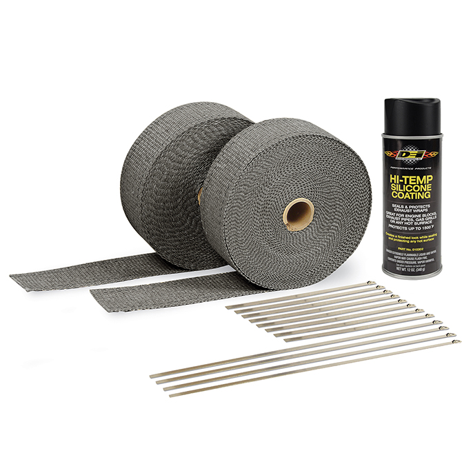 Exhaust Wrap Kits solve the problem of knowing exactly what you need to wrap exhaust pipes and manifolds and dose it in an all-in-one kit.An all-in-one kit for wrapping a set of headers or motorcycle pipes. Automotive kit includes two 2” x 50ft rolls of exhaust wrap one can of HT Silicone Coating & Locking Ties. The header wrap kit is enough for any set of V8 headers. The Header Wrap Kit will wrap from the top of the header where it bolts to the heads all the way down to the collector. Exhaust Wrap Kits save you time and money.