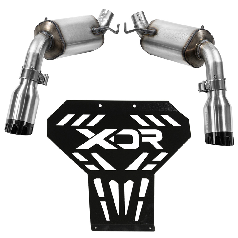 This Competition dual exhaust system fits 2013-18 Can-Am Maverick 1000R and Maverick Max 1000R with the normally aspirated engine. Features include 409S stainless steel construction, 2.25-inch mandrel bent inlet tubes flowing into XDR Competition series mufflers. The mandrel bent tailpipes and high-flow XDR mufflers provide a moderately aggressive deep sound and include USFS qualified spark arrestors. The system is finished off with a pair of 3.50-inch dual wall brushed 304s stainless steel tips with CNC machined black anodized aluminum end caps that accent the black powder coated heat shield sporting the XDR logo, showing everyone behind you why your Maverick sounds so good. Includes all parts, hardware, and instructions necessary for a simple at home installation. Notes: This bolt-on system does not affect emissions and can be used for on-road or trail use. Does not fit Turbocharged, Trail or X3 models.