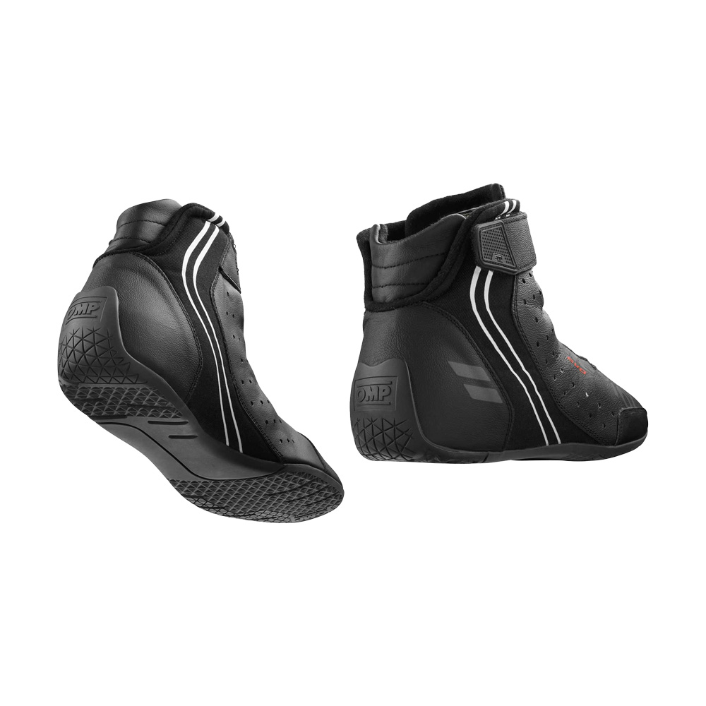Top level shoes FIA 8856-2018 made in ultrasoft leather and fabric inserts. High resistant new generation two-tone outsole sole for maximum grip. Velcro strap for best fitting. Structure designed to increase the sensitivity on the pedal, thin laces for high sliding and a quick lacing of the boots, rear bellow for maximum freedom of movement.