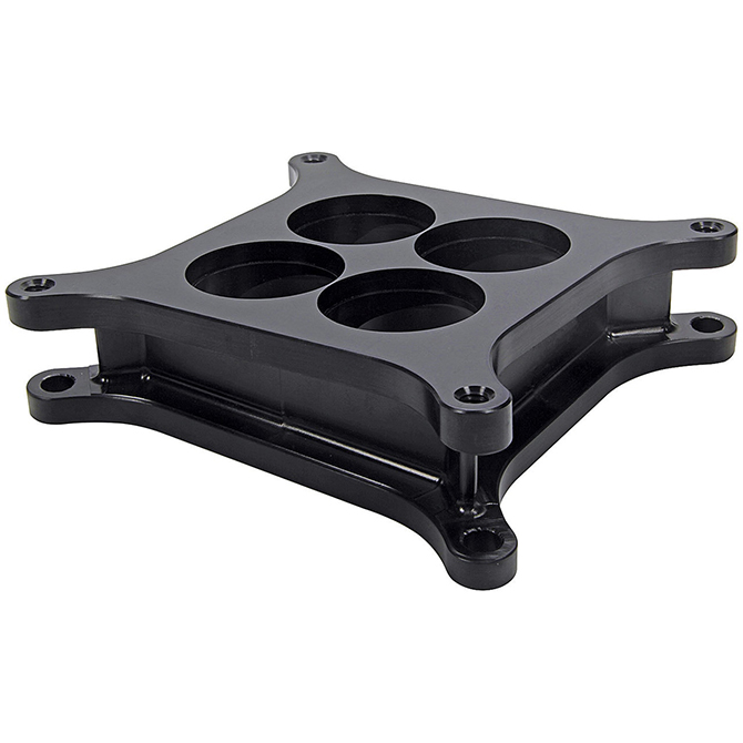 Four-hole aluminum spacer angles the carburetor left and to the rear so the carb is closer to level when in race attitude. Spacer accepts 1/2" or 1" tapered inserts which can be changed quickly by removing the carb. Inserts restrict air/fuel entry and reduce power slightly to prevent wheel spin and range in size from 0.950" to 1.400" for custom tailoring and quicker lap times. Spacer works with most Holley 4bbl. 4150/4160 series carburetors. Inserts sold separately.