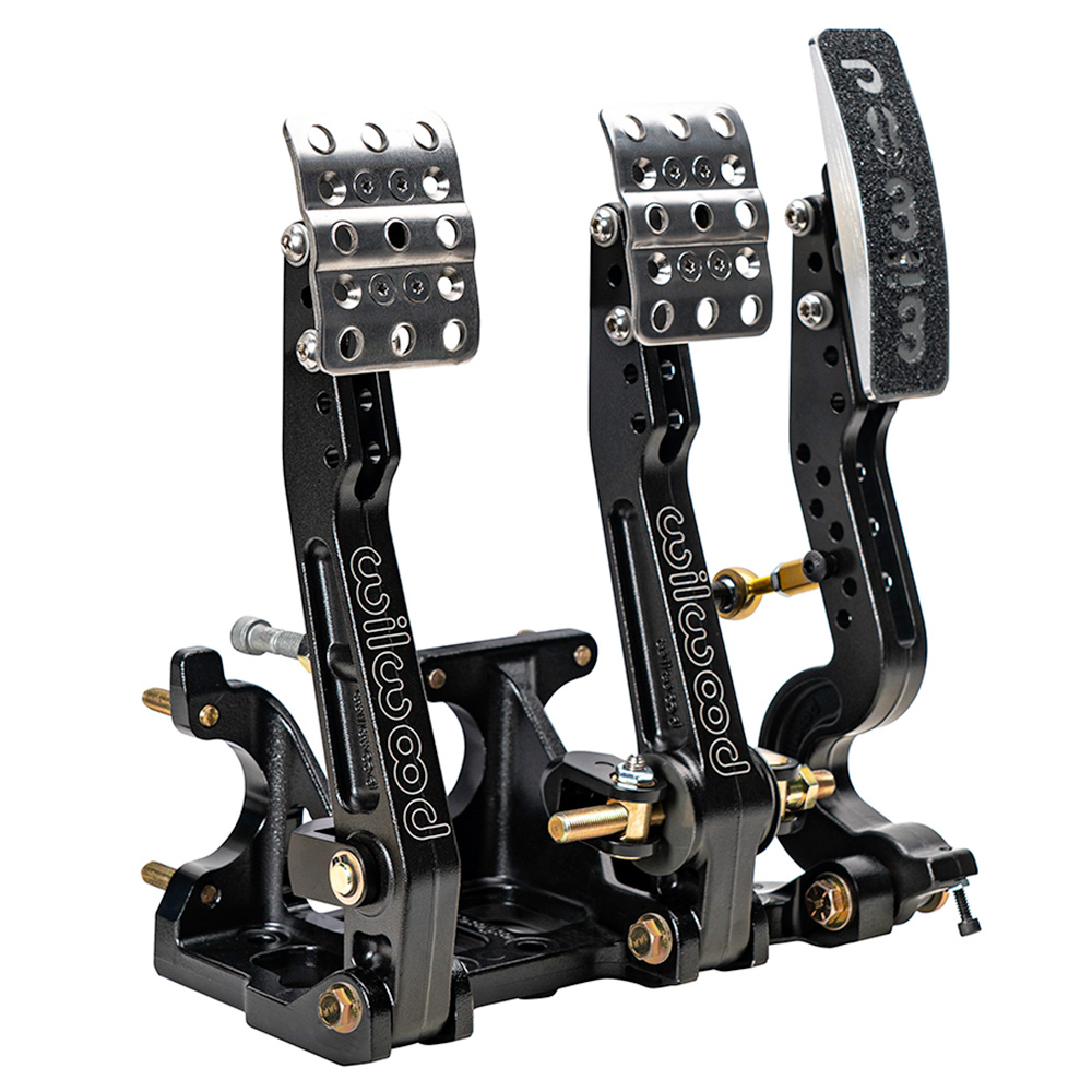 Adjustable ratio balance bar brake pedal, in a floor mount throttle, brake and clutch pedal assembly with throttle linkage for front engine cars. Pedal head adjusts vertically to provide a 4.75, 5.25, or 5.75:1 ratio for more feel or less pedal effort. A clutch and two brake master cylinders mount to the assembly, with an adjustable balance bar providing front to rear brake bias fine tuning. The throttle pedal includes an adjustable ratio bell crank for front engine applications. The non-skid waffled pedal pads can be laterally adjusted to place the clutch and brake from 3.75 to 5.75 inches on center for driver preference. The pedals feature a lightweight aluminum frame, with high strength reinforced I-beam style forged pedal arms. The balance bar incorporates a positive detent stop every full turn to maintain adjustment position and can be locked in place with the included jam nut, or used with an optional remote knob for quick on-track adjustments. A pin and clevis pushrod attachment system ensures the smallest possible misalignment angle for bind free operation through the entire range of travel. This pedal accepts three Wilwood 2.25 inch vertical mount flange single outlet master cylinders, available separately in a variety of styles and bore sizes.
