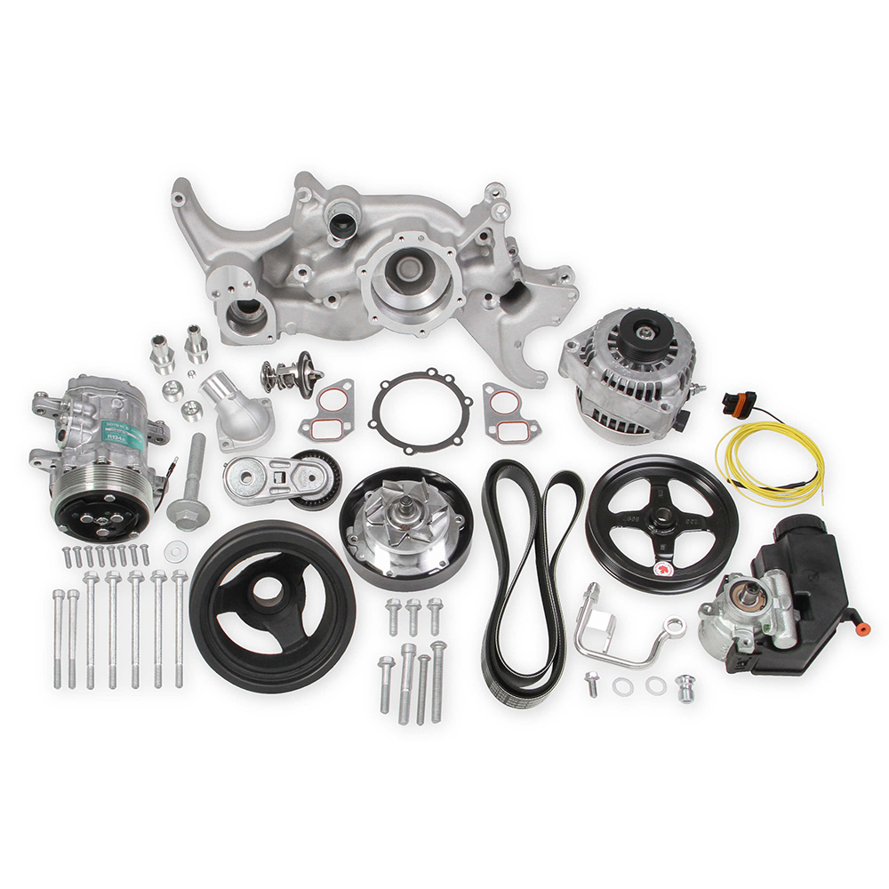 Holley Mid-Mount Complete Accessory System, LS Engine Drive includes SD7 A/C Compressor, Alternator, P/S Pump, Tensioner, Belt, crank damper & Pulleys. Part #20-185