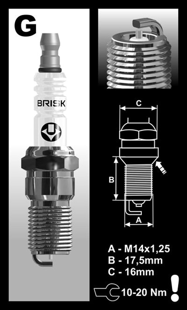 Brisk GR12S Silver Racing Spark plug is designed for forced induction applications and nitrous applications. Brisk GR12S Silver Racing Spark Plug replaces NGK heat range 8. Most popular applications are modified Ford Lightining and Harley trucks, Ford Mustang Cobra & GTO.